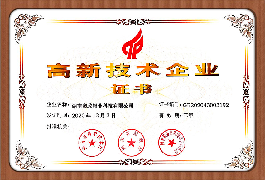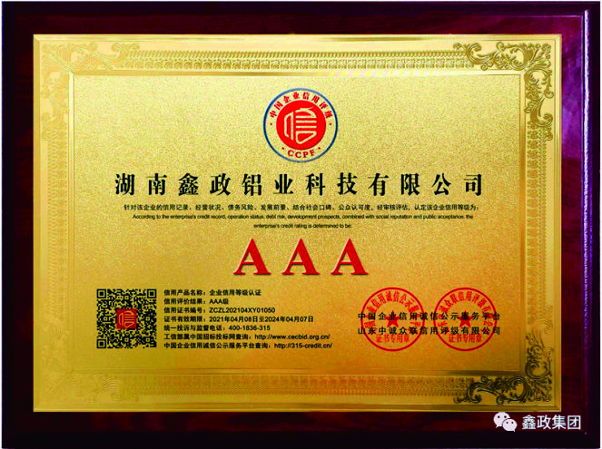 瀏覽次數(shù):1386近日,鑫政集團子公司鑫政鋁業(yè)喜報頻傳,再獲殊榮。根據(jù)湖南省2020年高新技術(shù)企業(yè)認定規(guī)定,經(jīng)專家評審、權(quán)威公示等程序,鑫政鋁業(yè)憑借產(chǎn)品研發(fā)、科研人才培養(yǎng)、質(zhì)量把控等方面的出色表現(xiàn),榮獲“高新技術(shù)企業(yè)”榮譽稱號。同時,經(jīng)過中國企業(yè)信用誠信公示服務(wù)平臺的嚴格審核,該公司榮獲“AAA級企業(yè)信用等級”證書。